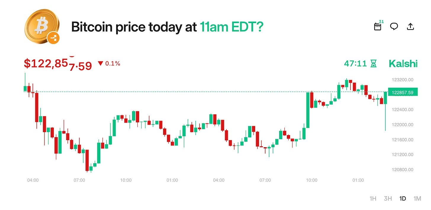 What might a casino-style game look like on Kalshi et al? One step could be quick-resolution markets on real-world events such as the Bitcoin price.